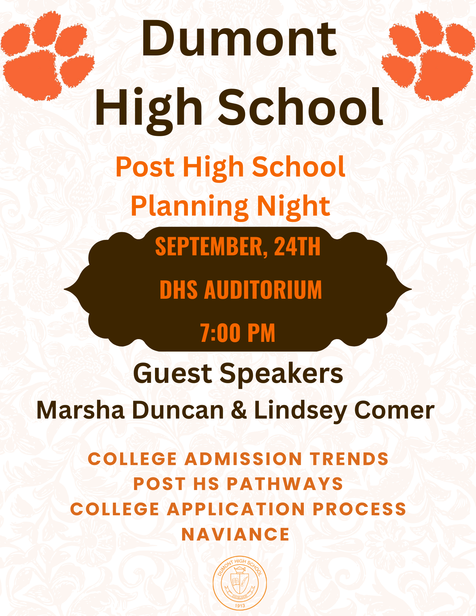 Senior Parent Night - Post High School Planning Learn about college admissions trends, post high school pathways, college application process and procedures and Naviance review.
